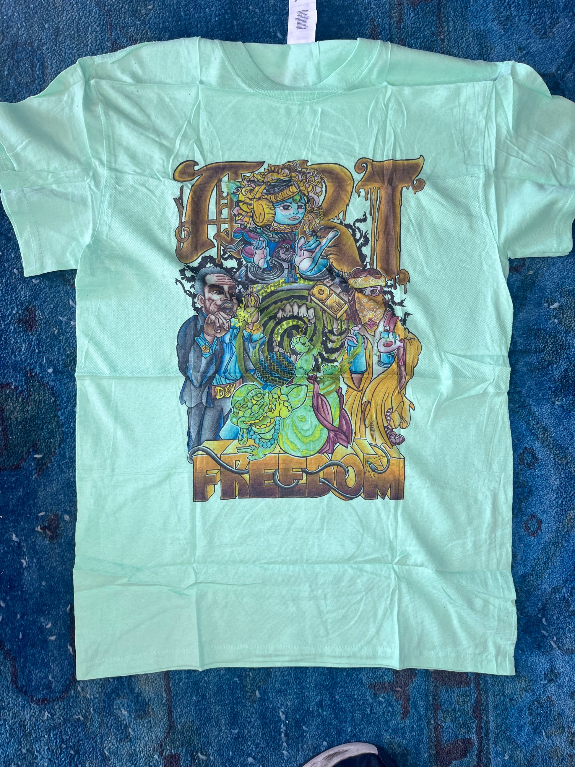 My amazing album art from the Art of Freedom printed on the front of a mens T shirt. The back is a graffiti'd Freedom Renegades Logo.